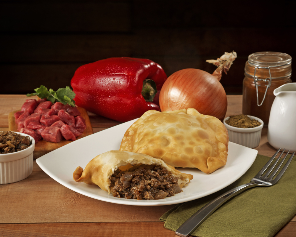 (Meat with Onion) Nuestra clásica Empanada de Pino hecha con posta molida, cebolla y condimentos.